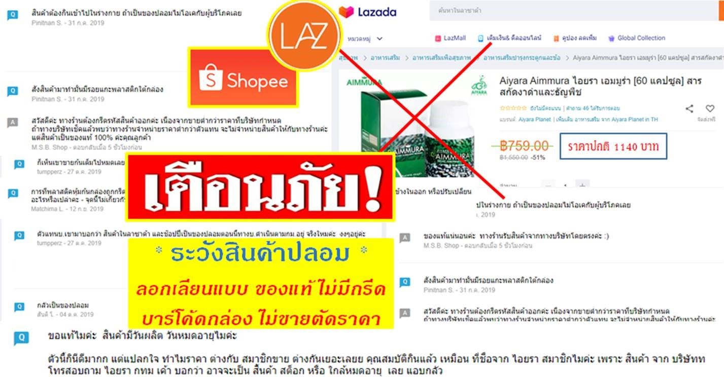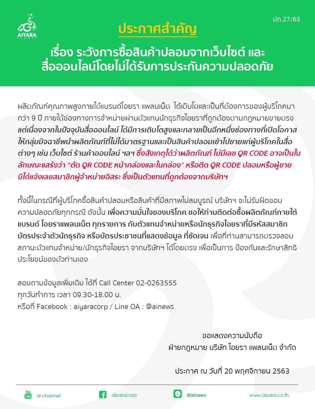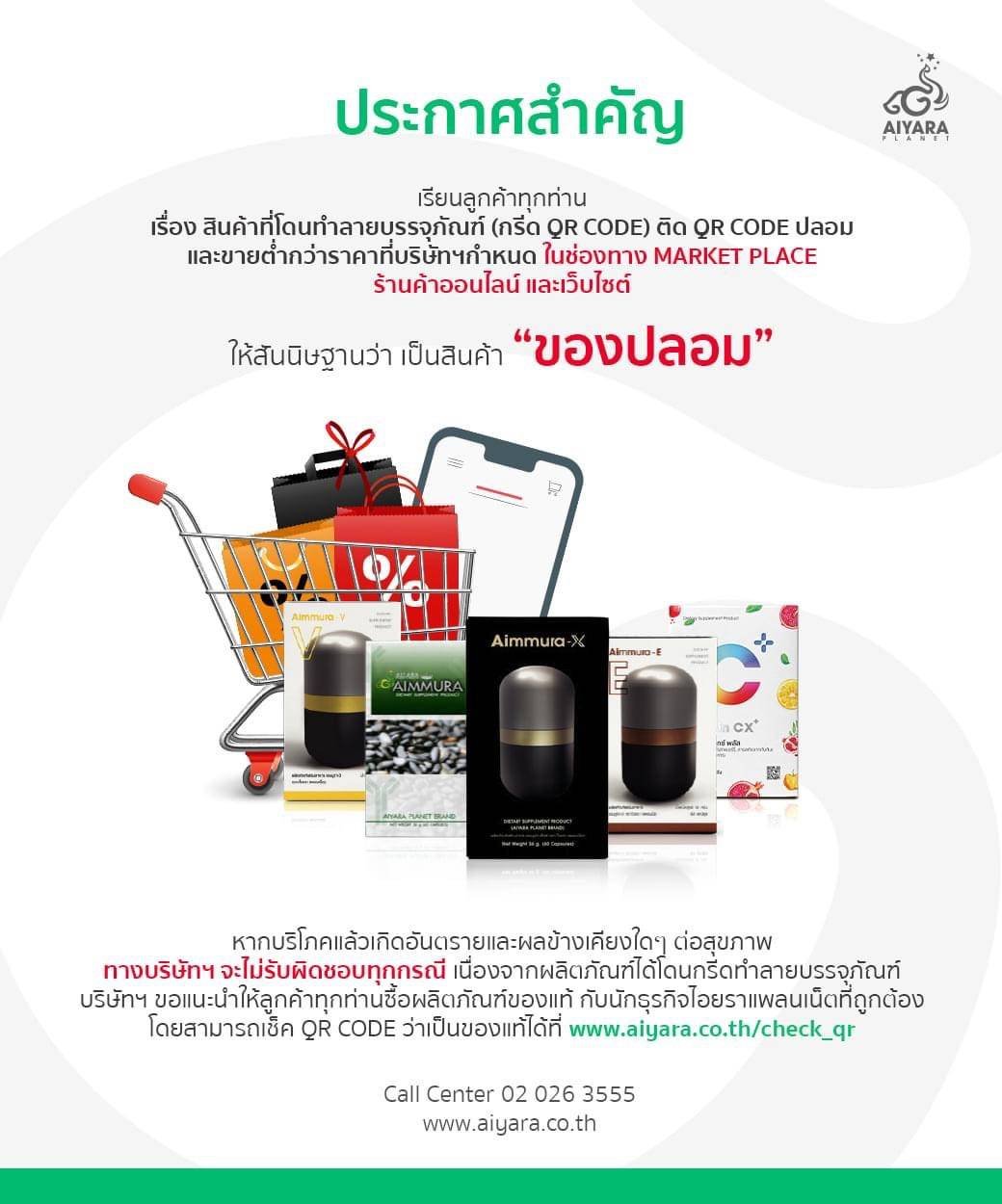 เพื่อสิทธิประโยชน์ของทุกท่าน สินค้าที่โดนทำลายบรรจุภัณฑ์ ติด "QR CODE" ปลอม และ ขายต่ำกว่าราคาที่กำหนด ให้สันนิษฐานว่าเป็นสินค้า "ของปลอม" หากบริโภคแล้วเกิดอันตราย และเกิดผลข้างเคียงใดๆ ต่อสุขภาพ ทางบริษัทฯ จะไม่รับผิดชอบทุกกรณี
