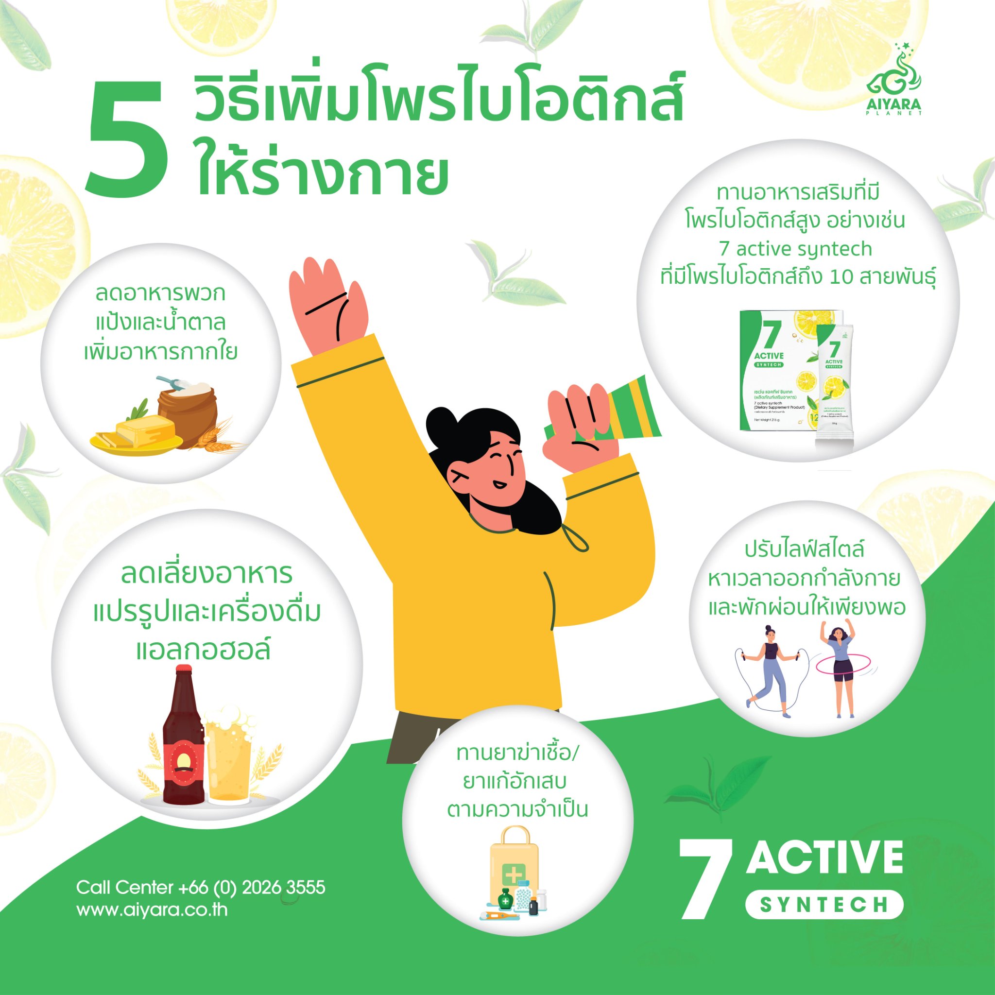5. ทานอาหารเสริมที่มีโพรไบโอติกส์สูง อย่างเช่น 7 Active Syntech ที่มีโพรไบโอติกส์ถึง 10 สายพันธ์ุ และยังมีพรีไบโอติกส์ 7 ชนิด โพสต์ไบโอติกส์ และไฟโตนิวเทรียนท์อีก 10 ชนิด