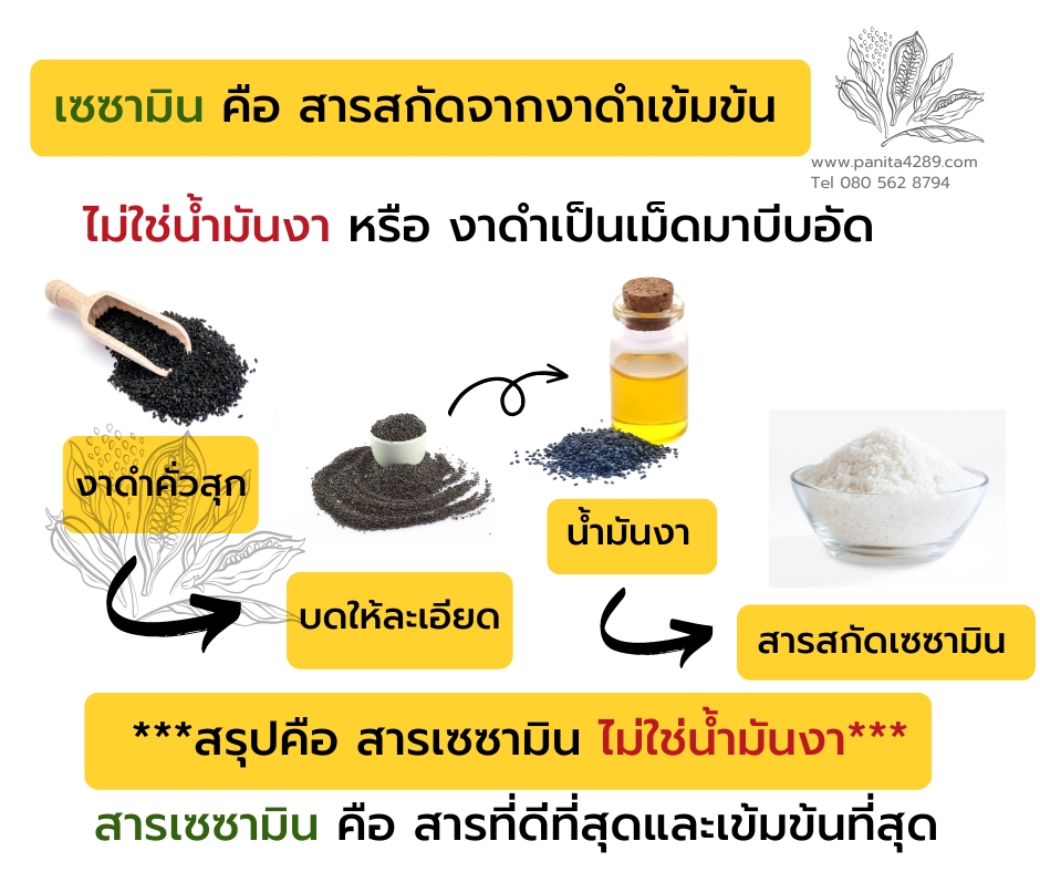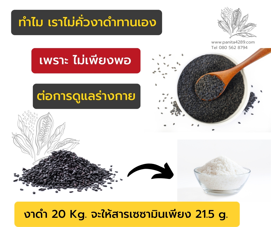 2)เราต้องทานงาดำในปริมาณมาก จึงจะได้สารเซซามินที่เพียงพอ เพราะงาดำ 20 kg. สกัดสารเซซามิน ได้เพียง 21.5 กรัม เท่านั้นเอง